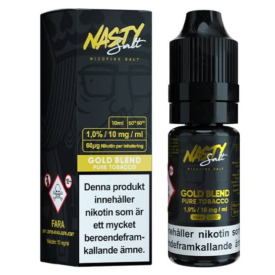 Nasty Gold Blend Salt är speciellt formulerad med de bästa ingredienserna, för att leverera nikotinet snabbare och används bäst i en enhet med låg effekt.