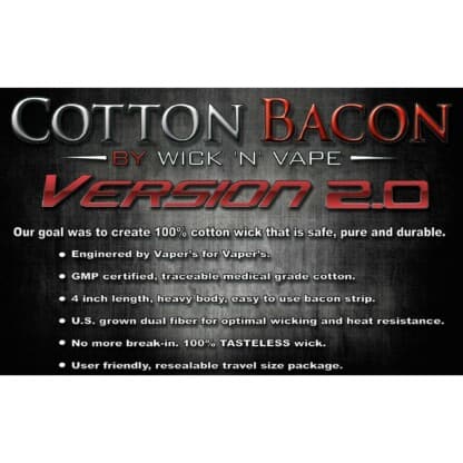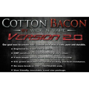 Cotton Bacon V2 är speciellt framtaget för vaping. Amerikanskt odlade bomullsfiber som fått genomgå en reningsprocess för att få bort orenheter, naturliga oljor och bekämpningsmedel, samt allt växtmaterial som inte är cellulosafiber då det inte bidrar till maximal uppsugningsförmåga.