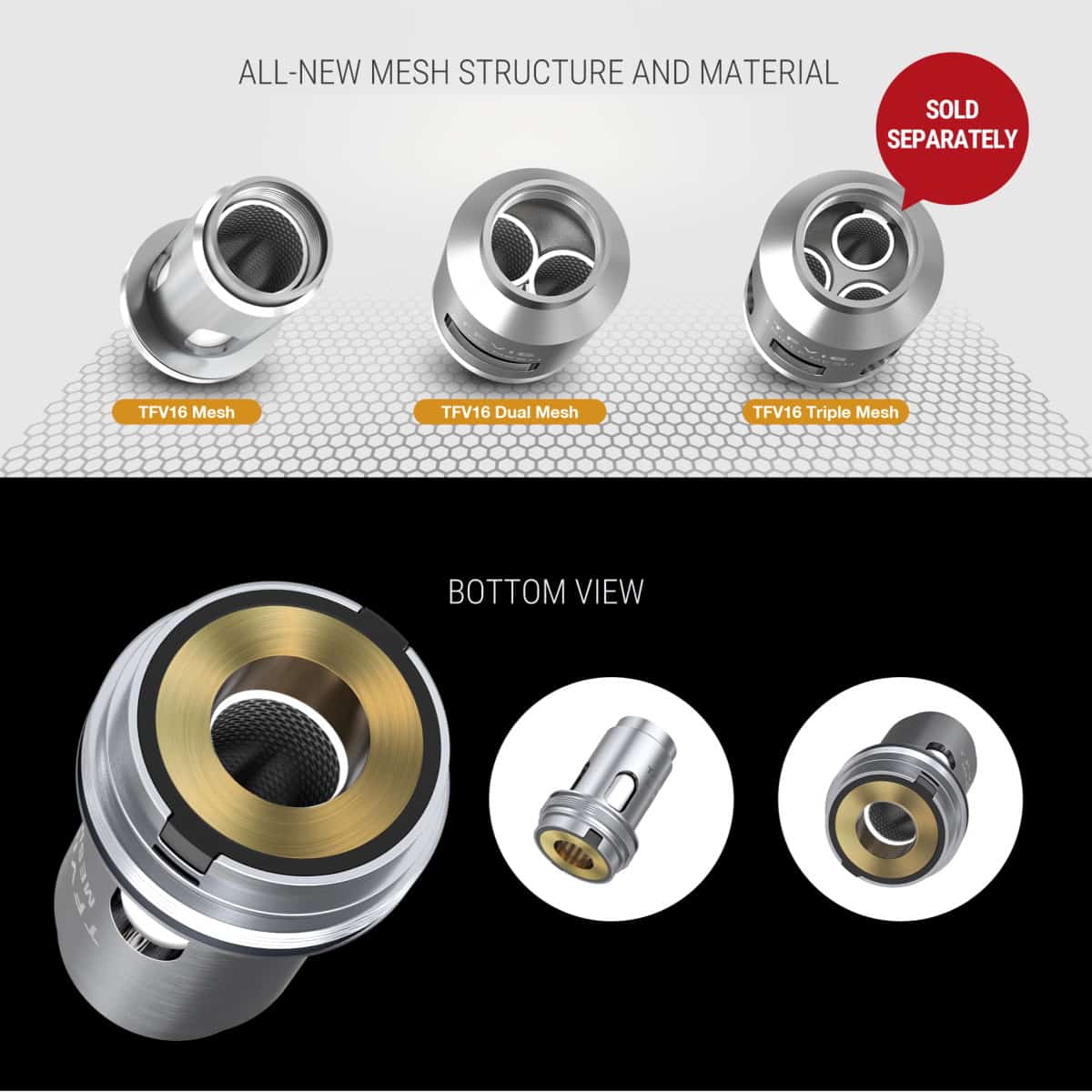 TFV16 tar över tronen bland Smok’s förångare. Detta är en tank som ger enorma moln men som kräver riktigt stora bloss av användaren, dvs en tank som inte passar för alla. De nya Mesh coilsen med honeycomb struktur är speciellt anpassade för TFV16 och finns i 3 olika versioner, varav de 2 medföljande körs optimalt runt 120W.