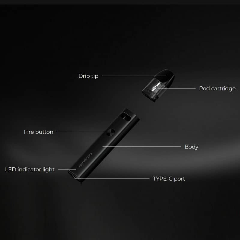 Caliburn A2 använder 0,9 Ω pods med fixerad coil som är lämpliga för mun-till-lunga (MTL). Caliburn A2 pods har också designats med ett speciellt format munstycke för att passa denna vaping-stil.