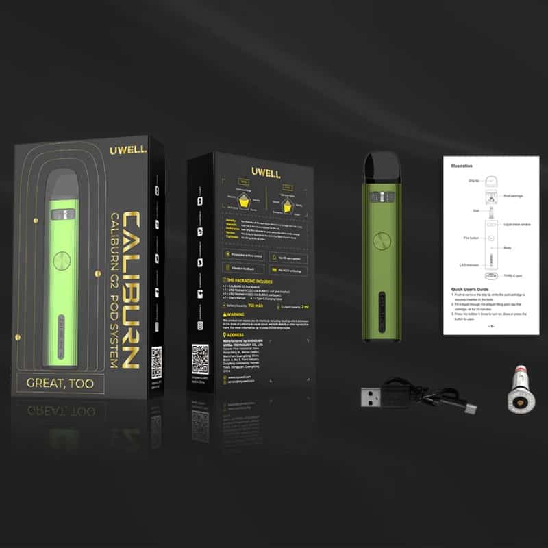 Uwell Caliburn G2 är ett litet och kompakt podsystem som är enkelt att använda utan några inställningar. Caliburn G2 har en autodraw funktion vilket innebär att den startar såfort du tar ett bloss, det går såklart även bra att använda sig av knappen. Poddarna har en volym på 2ml och till skillnad från sitt syskon Caliburn A2 så kan man byta själva coilen i podden. Det inbyggda batteriet har en kapacitet på 750mAh och laddning sker via USB-C.